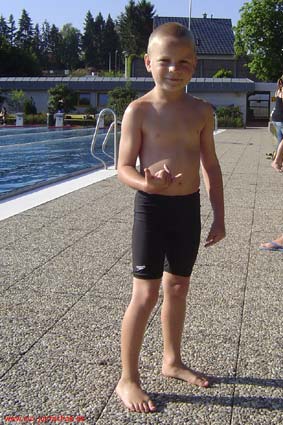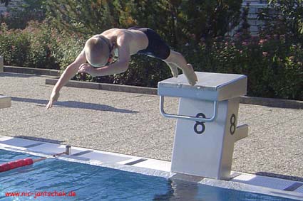 Das daß Wasser nicht die natürliche Umgebung vom Mensch ist kann ich eigentlich nicht behaupten. Ich fühle mich in diesem Element einfach sauwohl. Die Startsprünge begeistern meine Schwimmtrainerin immer wieder aufs neue. Salto vom Einser und Dreier, Köpfer vom Dreier und Sprünge vom 5m Turm machen einfach Spaß und verblüffen die “größeren Badegäste”. Mit den Sprüngen vom 10m Turm am 29.06.2008 in Hof habe ich sogar meinen sonst so fordernden Pappa geschockt.